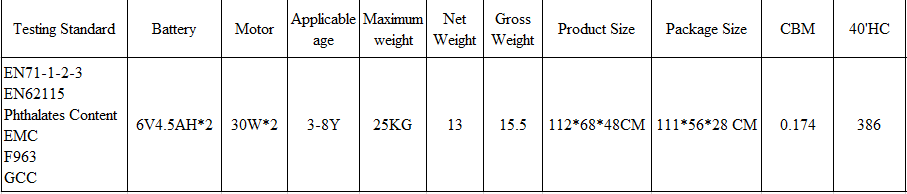 double door;12V double moto,double battery;high and low speed regulation;forward & reverse;USB,MP3 volume+-;2.4G R/C 3 speed regulation,4 wheel shock absorber;key start,light switch;alarm light switch;megahone